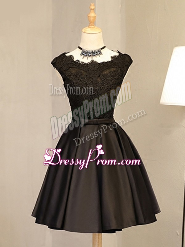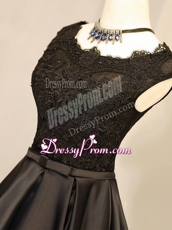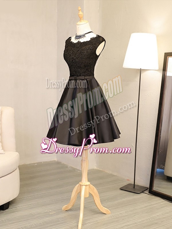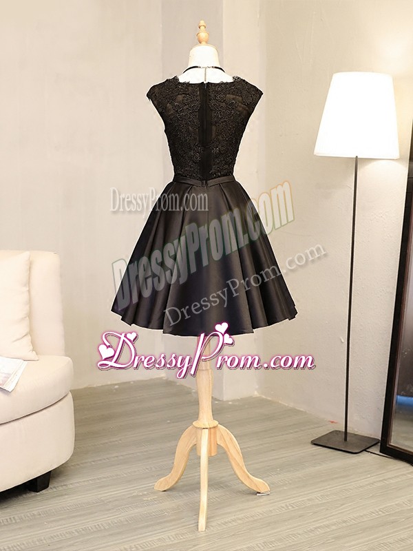 Neckline : ScoopShown Color : BlackSilhouette : A-lineSleeve Length : sleevelessHemline : mini lengthBack Detail : ZipperFabric : SatinEmbellishment : Lace,AppliquesOccasion : Prom,Party,Sweet 16Season : Spring,Summer,Fall