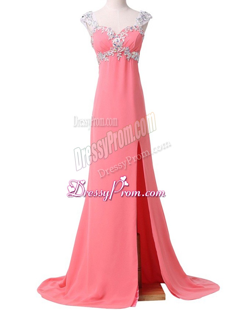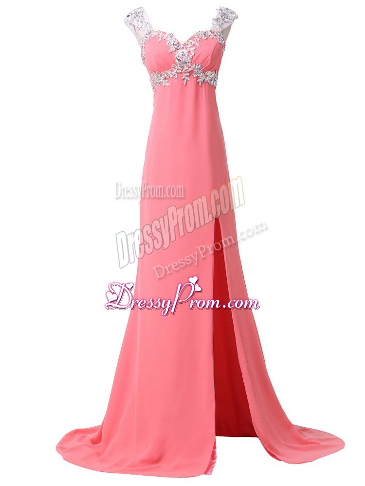 Neckline : SweetheartShown Color : Watermelon RedSilhouette : EmpireSleeve Length : cap sleevesBack Detail : ZipperFabric : ChiffonEmbellishment : Beading,AppliquesOccasion : Prom,Military Ball,Sweet 16Season : Spring,Summer,Fall,Winter