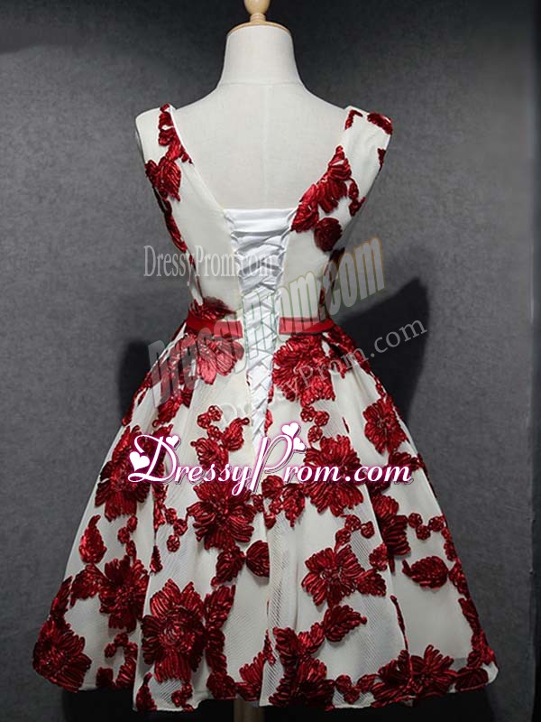 Cute Mini Length White And Red Prom Dresses Organza Sleeveless Lace and Appliques