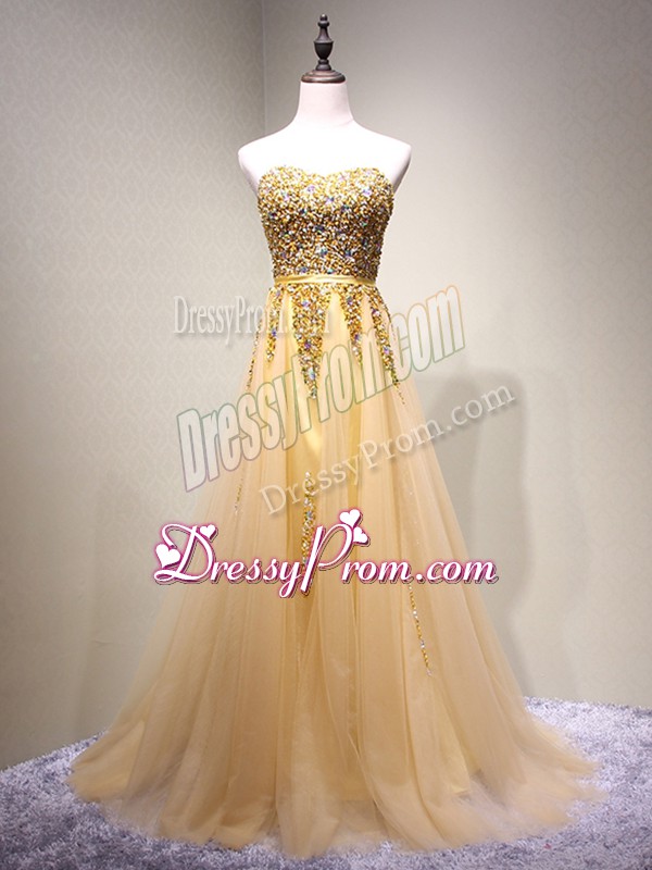 Neckline : SweetheartShown Color : ChampagneSilhouette : EmpireSleeve Length : sleevelessHemline : floor lengthBack Detail : Lace upFabric : TulleEmbellishment : BeadingOccasion : Prom,Party,Sweet 16Season : Spring,Summer,Fall