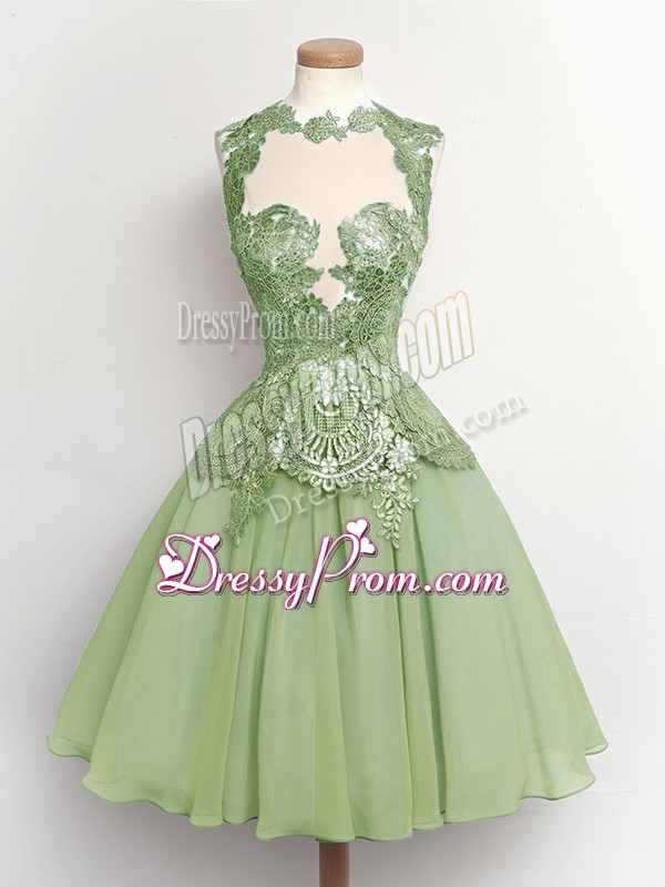 Neckline : High-neckShown Color : GreenSilhouette : A-lineSleeve Length : sleevelessHemline : knee lengthBack Detail : Lace upFabric : ChiffonEmbellishment : LaceOccasion : Prom,Party,Wedding PartySeason : Spring,Summer,Fall