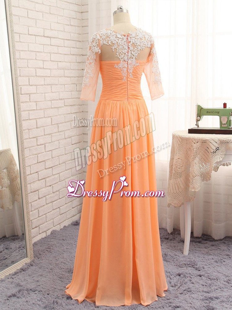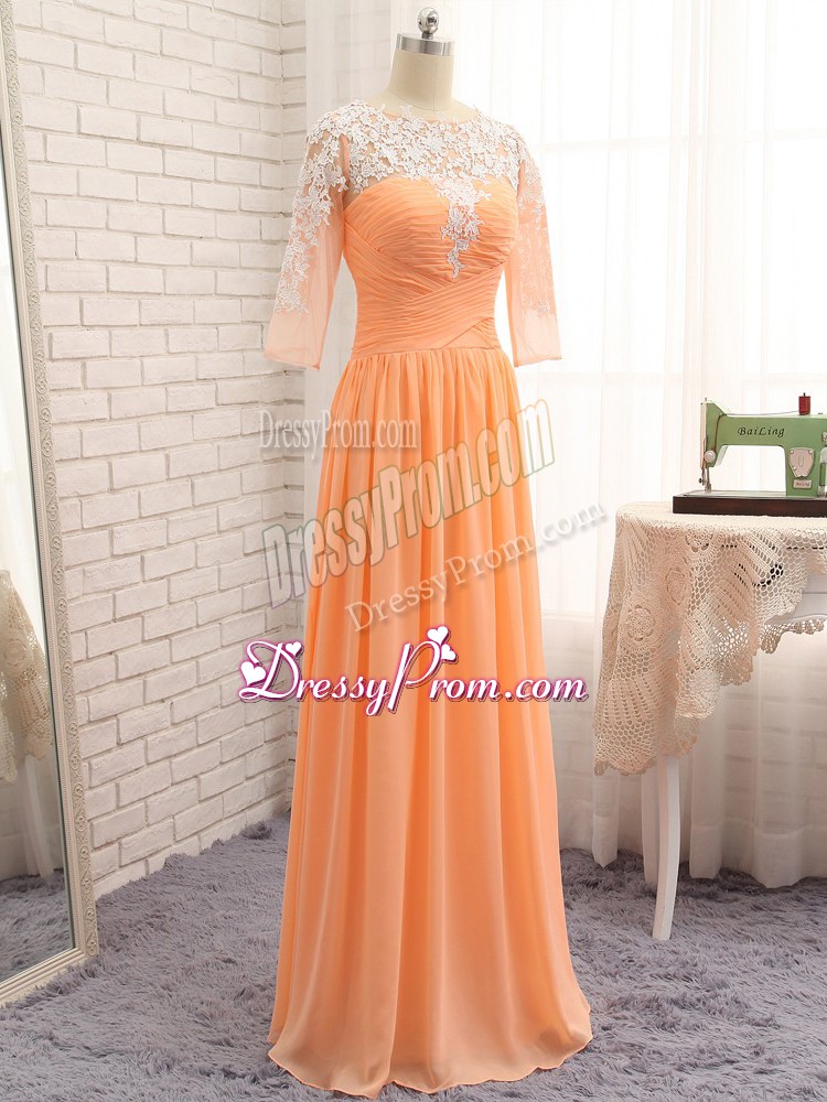 Neckline : BateauShown Color : OrangeSilhouette : EmpireSleeve Length : long sleevesHemline : floor lengthBack Detail : ZipperFabric : ChiffonEmbellishment : Lace,Appliques,RuchingOccasion : Prom,Party,Military BallSeason : Spring,Summer,Fall,Winter