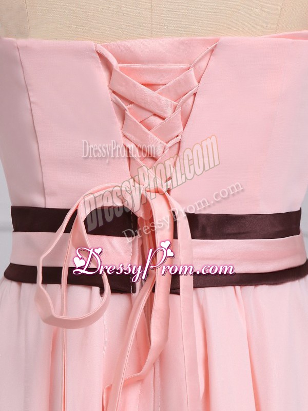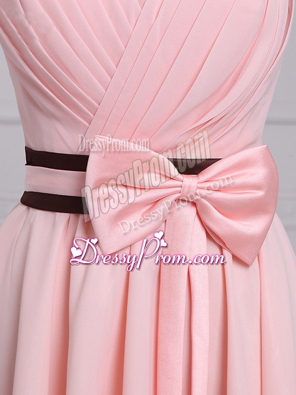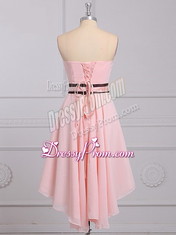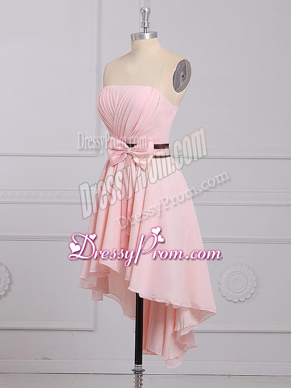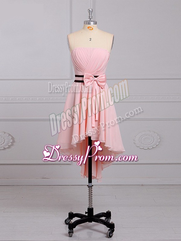 Neckline : StraplessShown Color : Baby PinkSilhouette : EmpireSleeve Length : sleevelessHemline : high lowBack Detail : Lace upFabric : ChiffonEmbellishment : Ruching,BowknotOccasion : Prom,Party,Wedding PartySeason : Spring,Summer,Fall,Winter