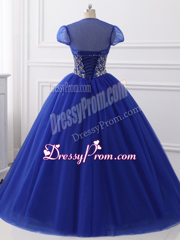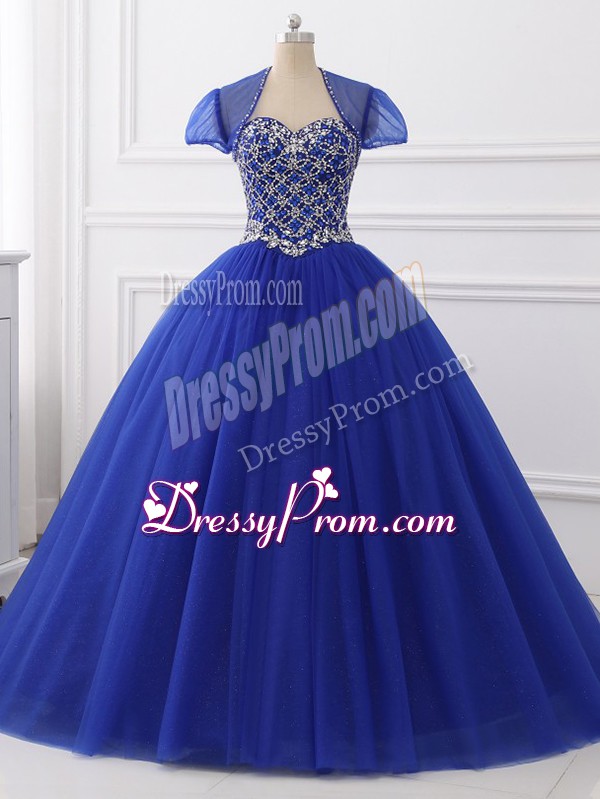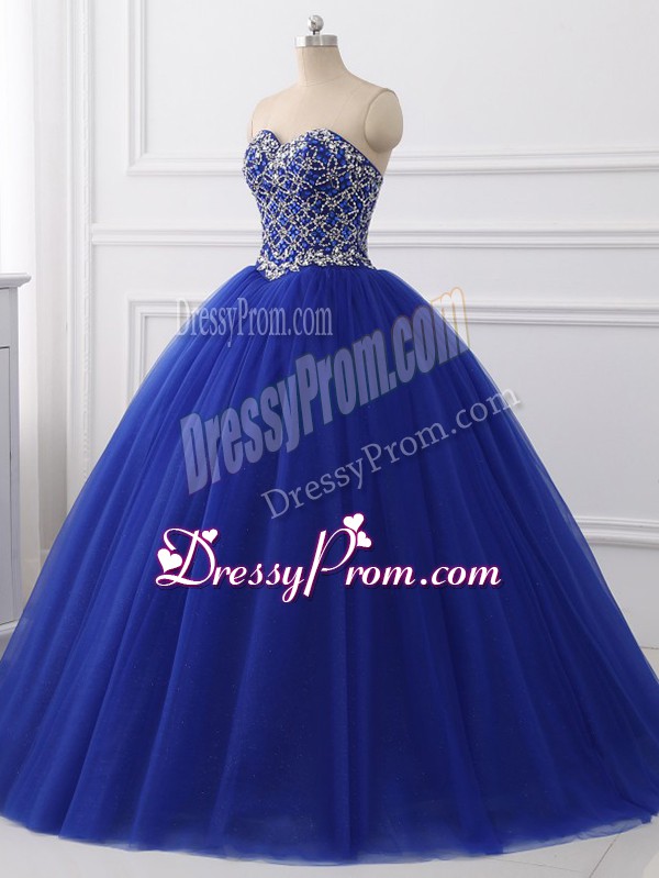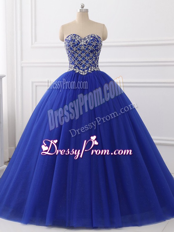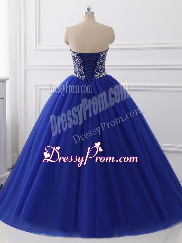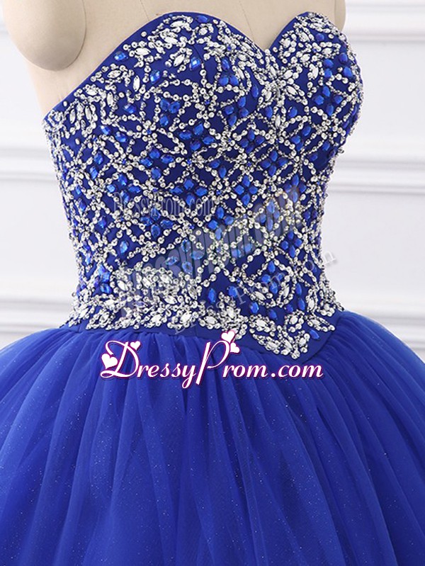 Neckline : SweetheartShown Color : Royal BlueSilhouette : Ball GownsSleeve Length : sleevelessHemline : floor lengthBack Detail : Lace upFabric : TulleEmbellishment : BeadingOccasion : Military Ball,Sweet 16,QuinceaneraSeason : Spring,Summer,Fall,Winter