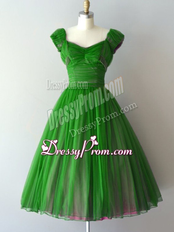 Neckline : V-neckShown Color : GreenSilhouette : A-lineSleeve Length : cap sleevesHemline : knee lengthBack Detail : Lace upFabric : ChiffonEmbellishment : RuchingOccasion : Prom,Party,Sweet 16Season : Spring,Summer,Fall