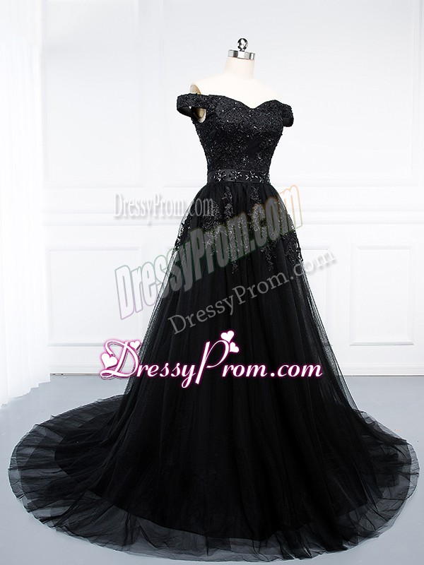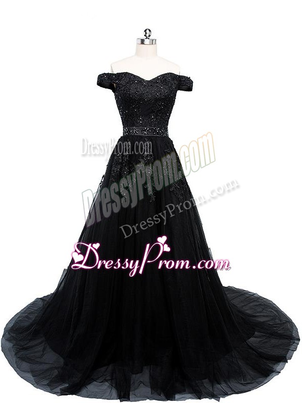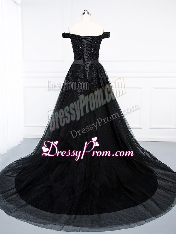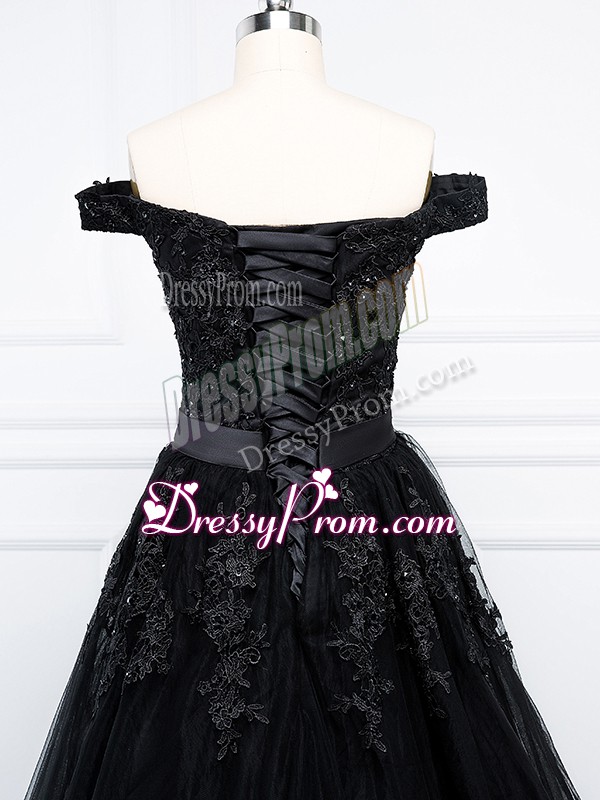 Neckline : Off the shoulder Shown Color : Black Silhouette : A-line Sleeve Length : sleeveless Back Detail : Lace up Fabric : Tulle Embellishment : Beading,Lace,Appliques Occasion : Prom,Military Ball,Sweet 16 Season : Spring,Summer,Fall,Winter