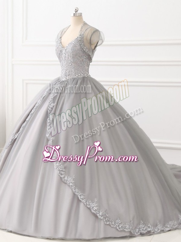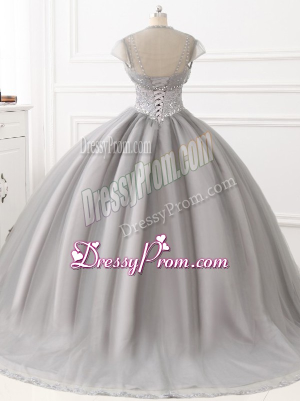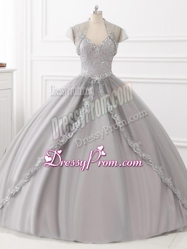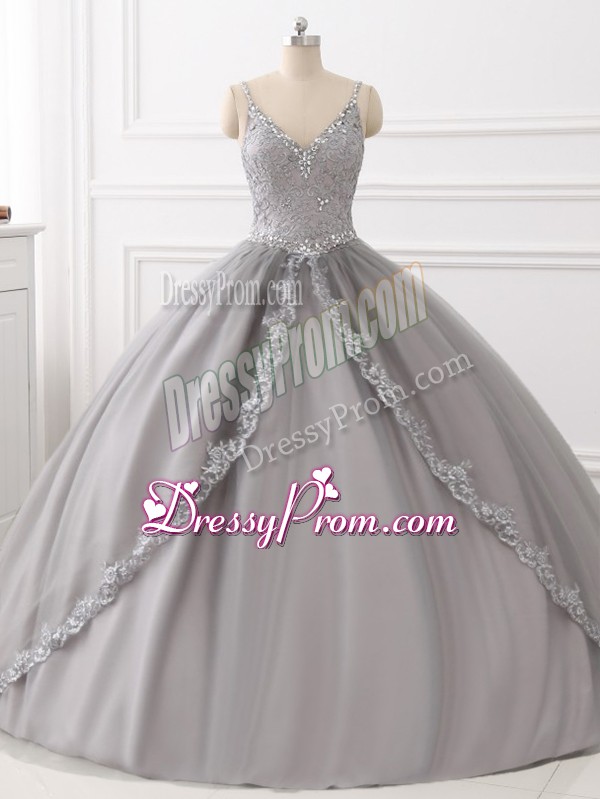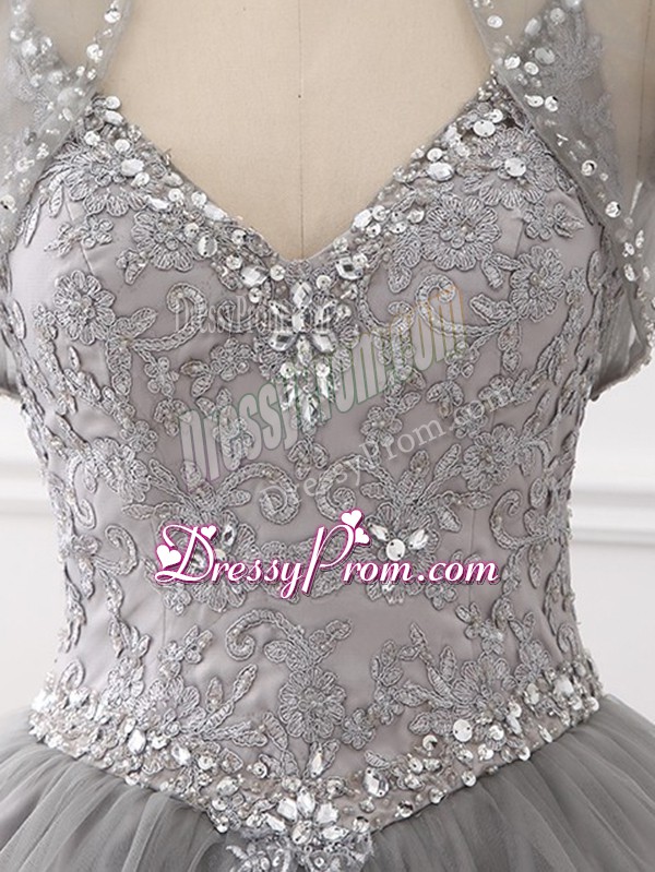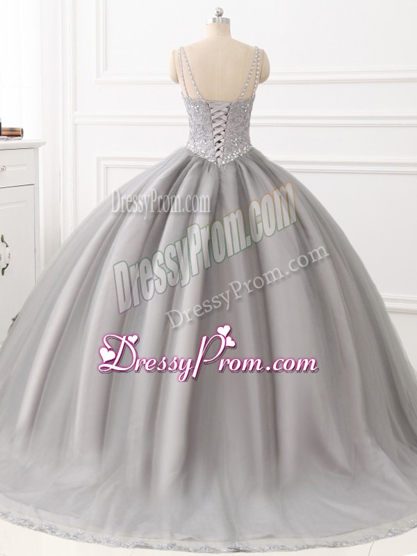 Neckline : StrapsShown Color : GreySilhouette : Ball GownsSleeve Length : sleevelessHemline : floor lengthBack Detail : Lace upFabric : TulleEmbellishment : Beading,AppliquesOccasion : Sweet 16,QuinceaneraSeason : Spring,Summer,Fall,Winter