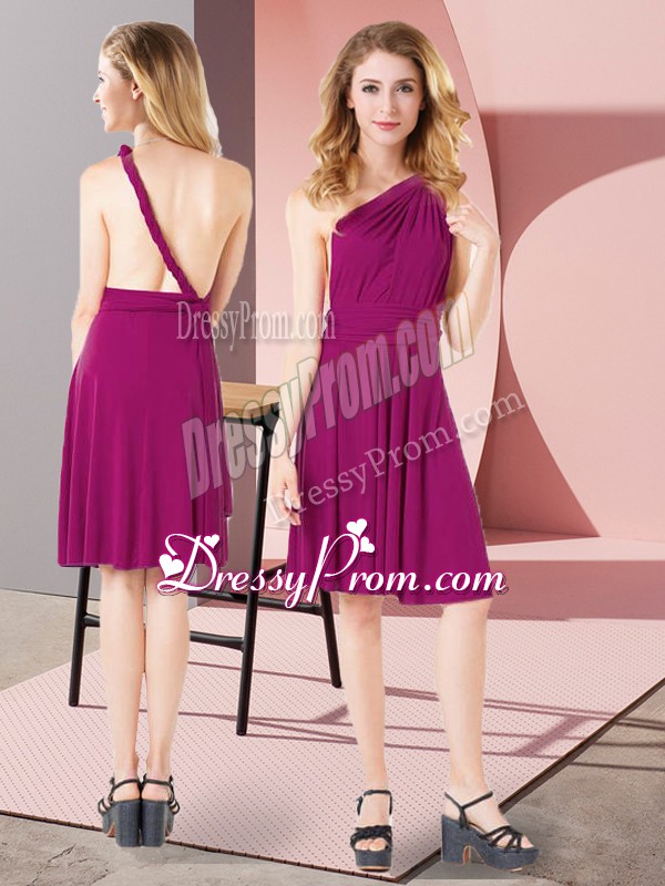 Neckline : One shoulderShown Color : FuchsiaSilhouette : EmpireSleeve Length : sleevelessHemline : mini lengthBack Detail : Criss crossFabric : Chiffon,Silk Like SatinEmbellishment : RuchingOccasion : Prom,Party,Wedding PartySeason : Spring,Summer,Fall