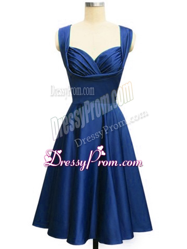 Neckline : StrapsShown Color : Royal BlueSilhouette : EmpireSleeve Length : sleevelessHemline : knee lengthBack Detail : Lace upFabric : TaffetaEmbellishment : RuchingOccasion : Prom,Party,Wedding PartySeason : Spring,Summer,Fall