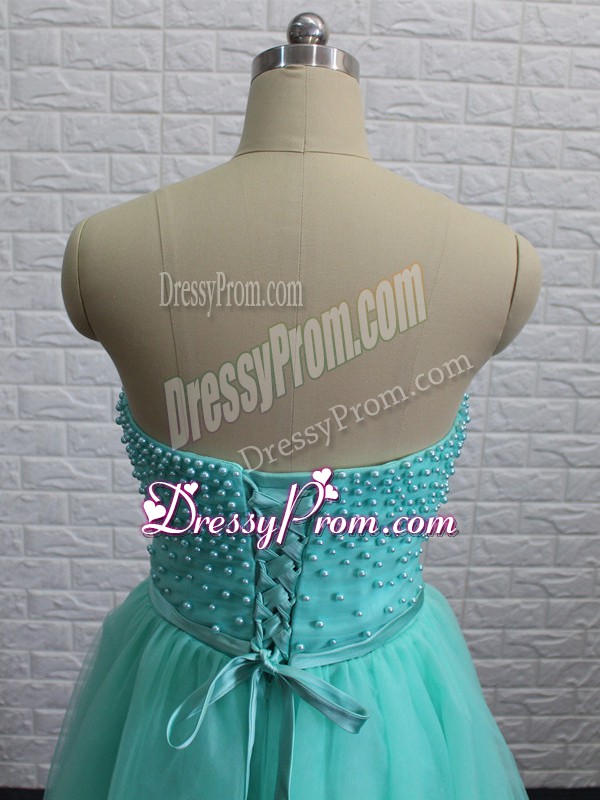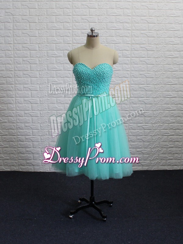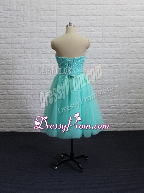 Neckline : SweetheartShown Color : Apple GreenSilhouette : A-lineSleeve Length : sleevelessHemline : knee lengthBack Detail : Lace upFabric : TulleEmbellishment : Beading,Sashes|ribbonsOccasion : Prom,PartySeason : Spring,Summer,Fall