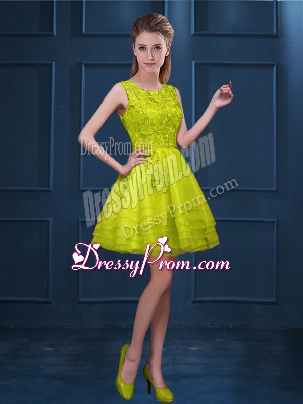 Neckline : ScoopShown Color : Yellow GreenSilhouette : A-lineSleeve Length : sleevelessHemline : knee lengthBack Detail : ZipperFabric : TulleEmbellishment : Lace,Ruffled LayersOccasion : Prom,PartySeason : Spring,Summer,Fall