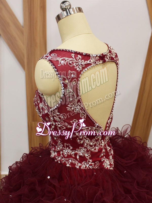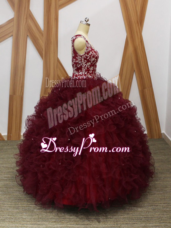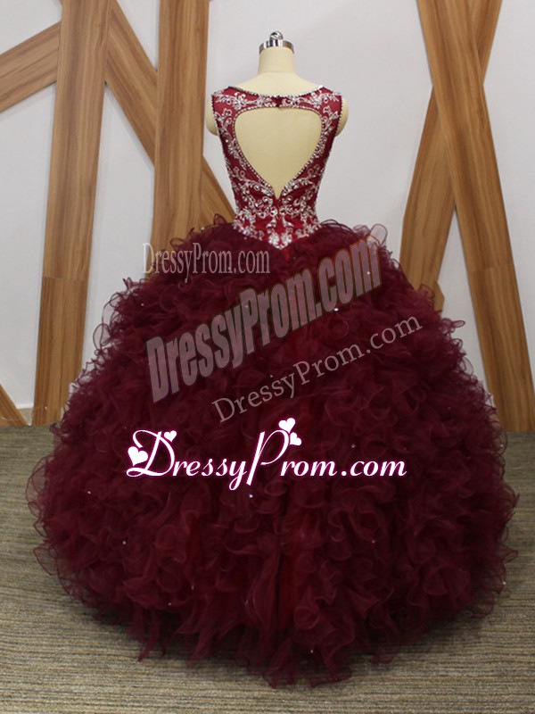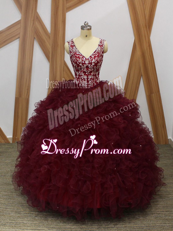Neckline : V-neckShown Color : BurgundySilhouette : Ball GownsSleeve Length : sleevelessHemline : floor lengthBack Detail : BacklessFabric : OrganzaEmbellishment : Beading,RufflesOccasion : Military Ball,Sweet 16,QuinceaneraSeason : Spring,Summer,Fall,Winter