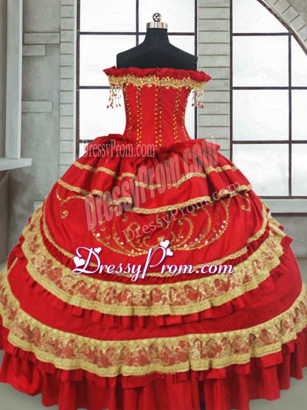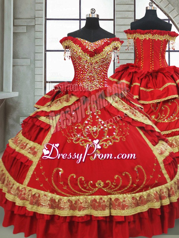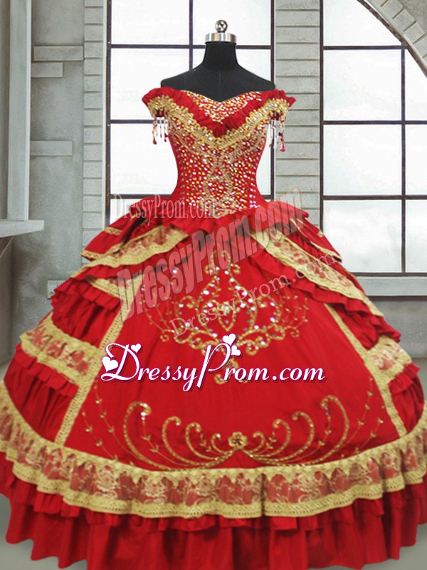 Stunning Red Ball Gowns Satin and Taffeta Off The Shoulder Cap Sleeves Beading and Embroidery and Ruffled Layers Floor Length Zipper Sweet 16 Quinceanera Dress