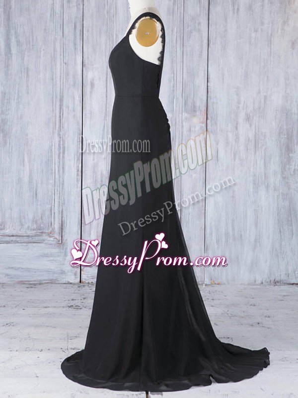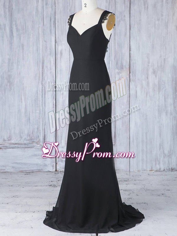 Neckline : StrapsShown Color : BlackSilhouette : Column/SheathSleeve Length : sleevelessBack Detail : ZipperFabric : ChiffonEmbellishment : AppliquesOccasion : Prom,Party,Wedding PartySeason : Spring,Summer,Fall,Winter