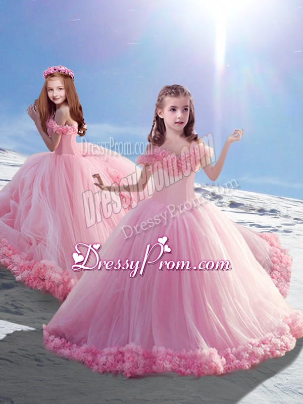 Great Baby Pink Sweet 16 Dress Military Ball and Sweet 16 and Quinceanera with Hand Made Flower Off The Shoulder Sleeveless Brush Train Lace Up