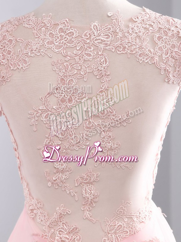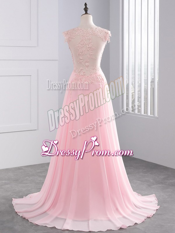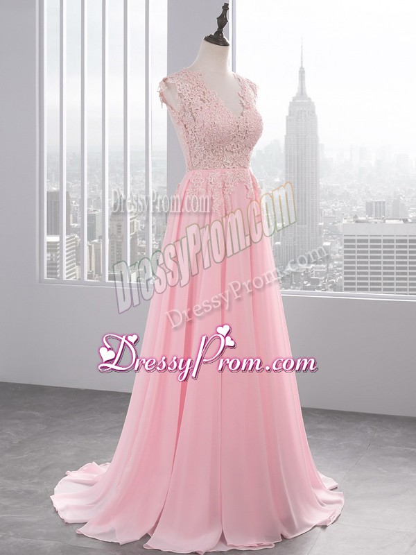 Neckline : V-neckShown Color : Baby PinkSilhouette : EmpireSleeve Length : sleevelessBack Detail : Side zipperFabric : ChiffonEmbellishment : AppliquesOccasion : Prom,Party,BeachSeason : Spring,Summer,Fall,Winter