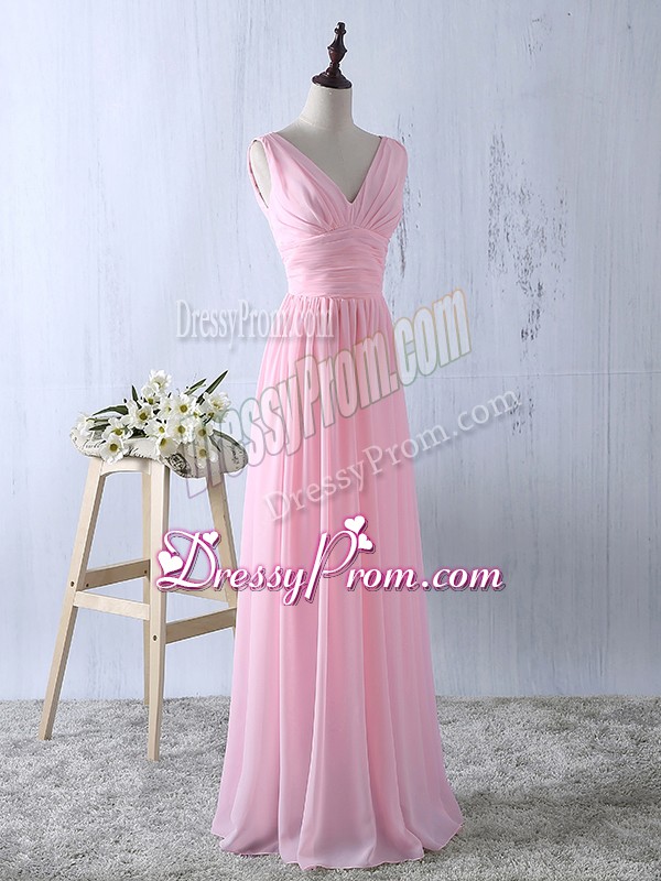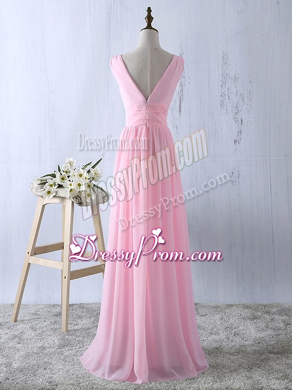 Neckline : V-neckShown Color : Baby PinkSilhouette : EmpireSleeve Length : sleevelessHemline : floor lengthBack Detail : ZipperFabric : ChiffonEmbellishment : RuchingOccasion : Prom,Party,Wedding PartySeason : Spring,Summer,Fall,Winter