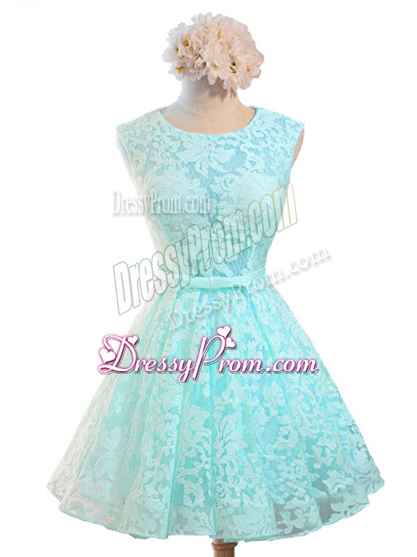 Neckline : Scoop Shown Color : Aqua Blue Silhouette : A-line Sleeve Length : sleeveless Hemline : knee length Back Detail : Lace up Fabric : Lace Embellishment : Belt Occasion : Prom,Party,Wedding Party Season : Spring,Summer,Fall