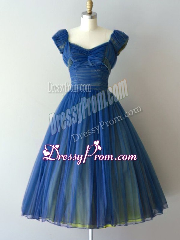 Neckline : V-neckShown Color : BlueSilhouette : A-lineSleeve Length : cap sleevesHemline : knee lengthBack Detail : Lace upFabric : Chiffon,TulleEmbellishment : RuchingOccasion : Prom,Party,Military Ball,Sweet 16Season : Spring,Summer,Fall