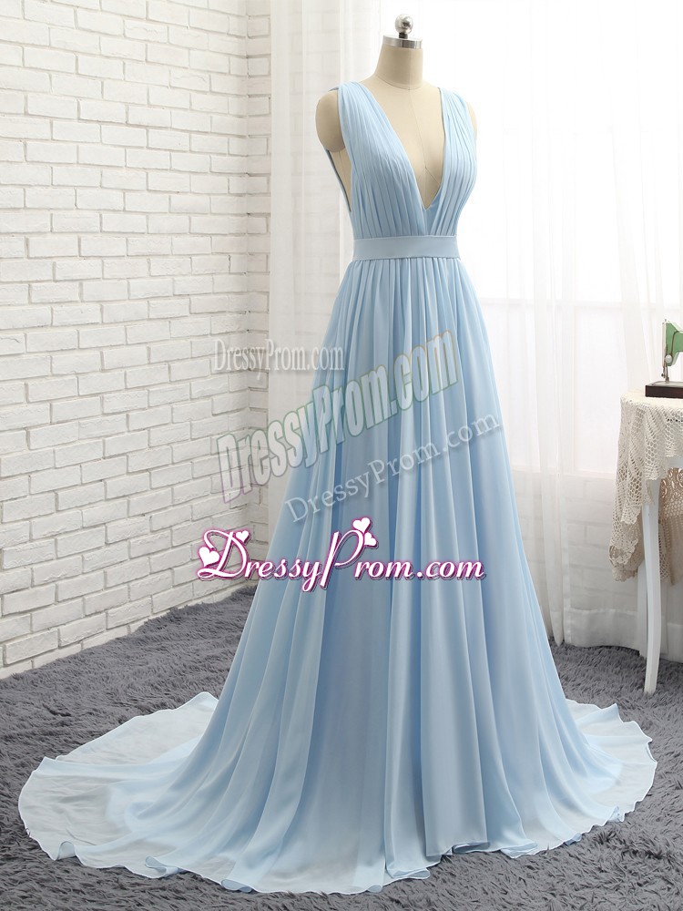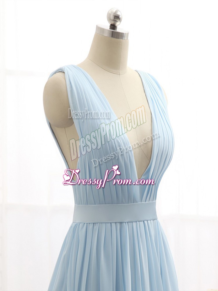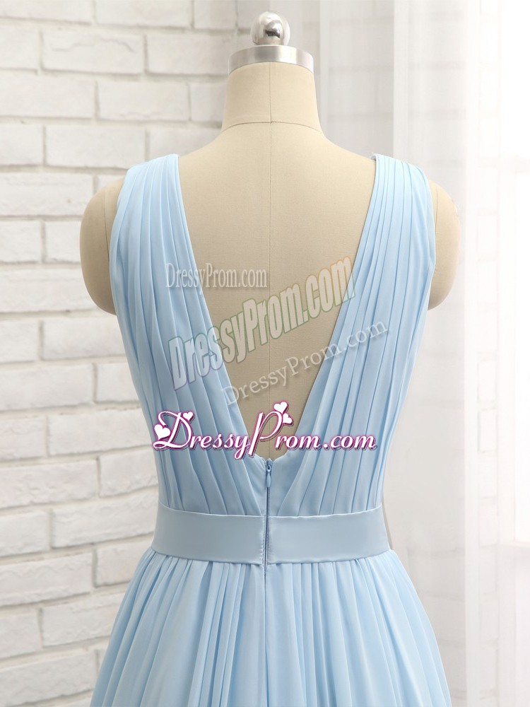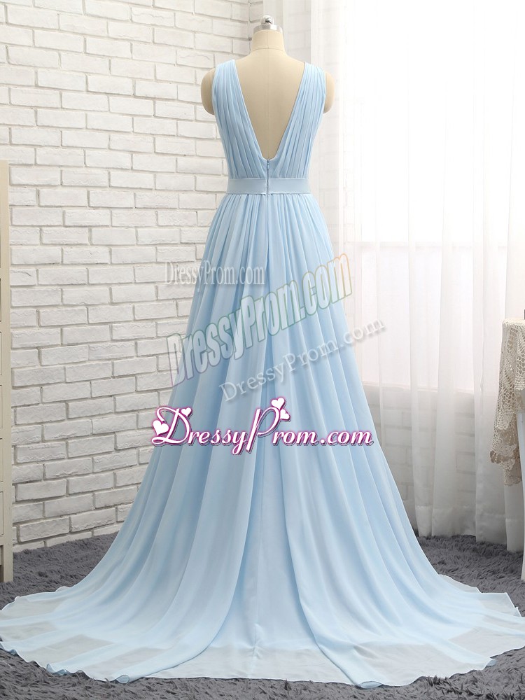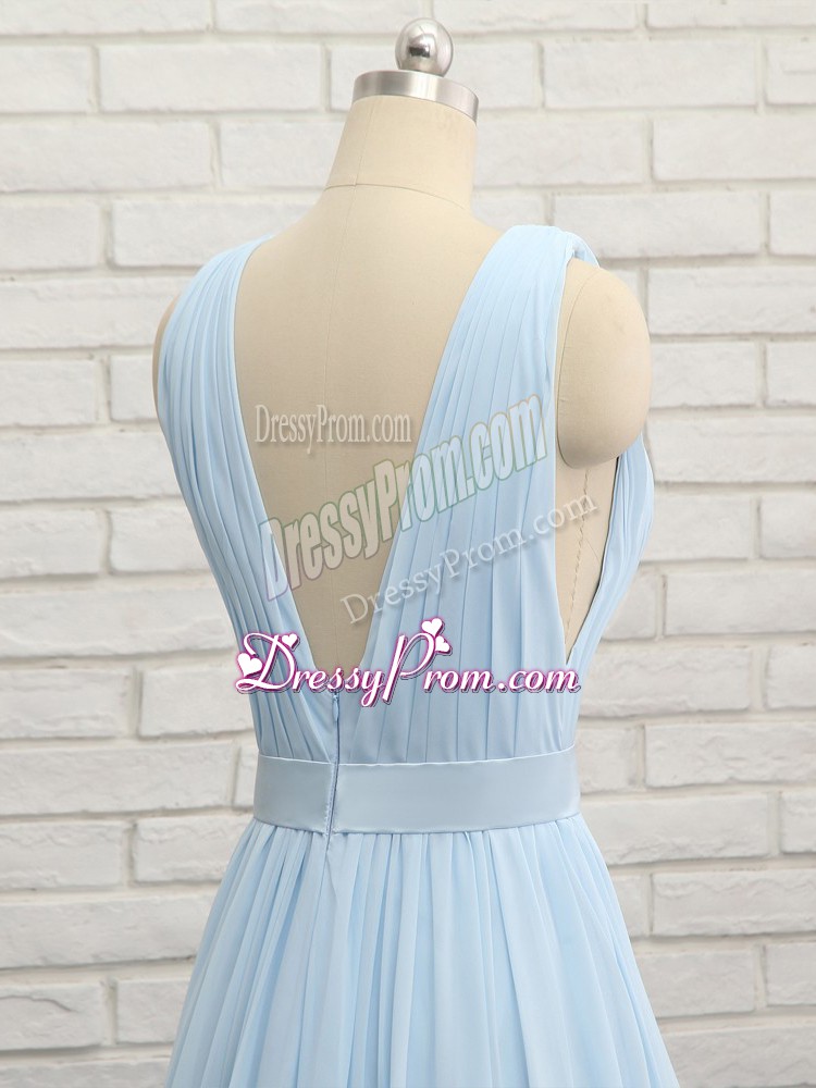 Neckline : V-neckShown Color : Light BlueSilhouette : EmpireSleeve Length : sleevelessBack Detail : BacklessFabric : ChiffonEmbellishment : Ruching,BeltOccasion : Prom,Party,Military BallSeason : Spring,Summer,Fall,Winter