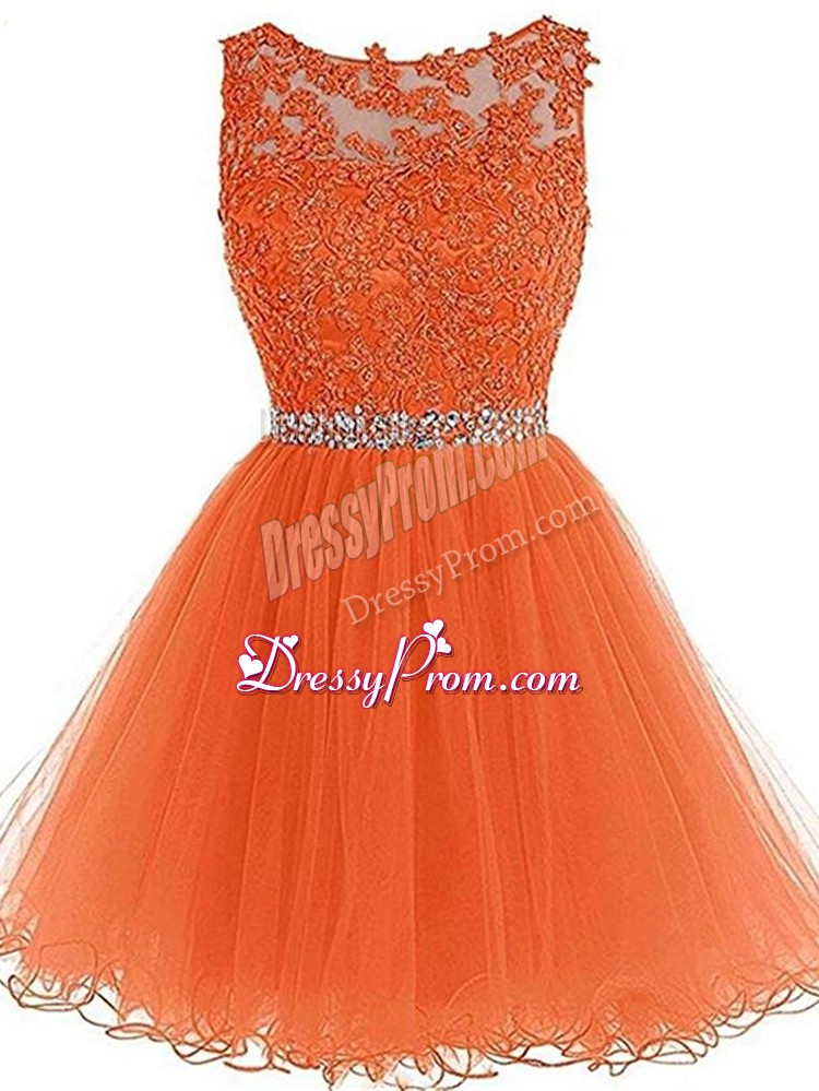 Neckline : ScoopShown Color : OrangeSilhouette : A-lineSleeve Length : sleevelessHemline : mini lengthBack Detail : ZipperFabric : TulleEmbellishment : Beading,RufflesOccasion : Prom,Party,Sweet 16Season : Spring,Summer,Fall