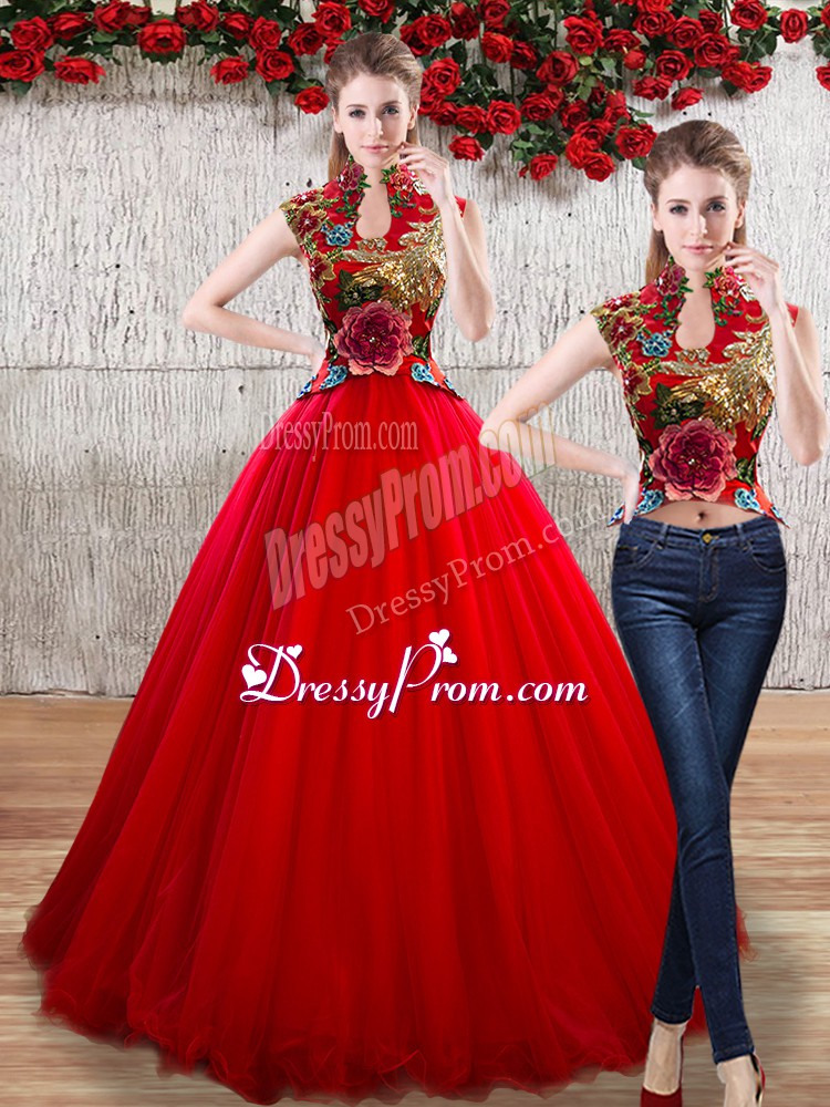 Neckline : High-neckShown Color : RedSilhouette : Ball GownsSleeve Length : sleevelessHemline : floor lengthBack Detail : Lace upFabric : OrganzaEmbellishment : AppliquesOccasion : Military Ball,Sweet 16,QuinceaneraSeason : Spring,Summer,Fall,Winter