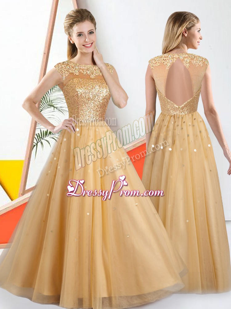 Neckline : BateauShown Color : ChampagneSilhouette : A-lineSleeve Length : sleevelessHemline : floor lengthBack Detail : BacklessFabric : TulleEmbellishment : Beading,LaceOccasion : Prom,PartySeason : Spring,Summer,Fall