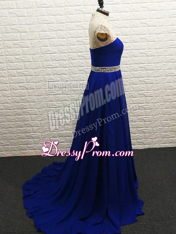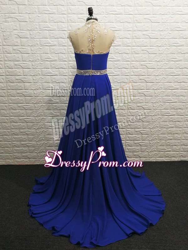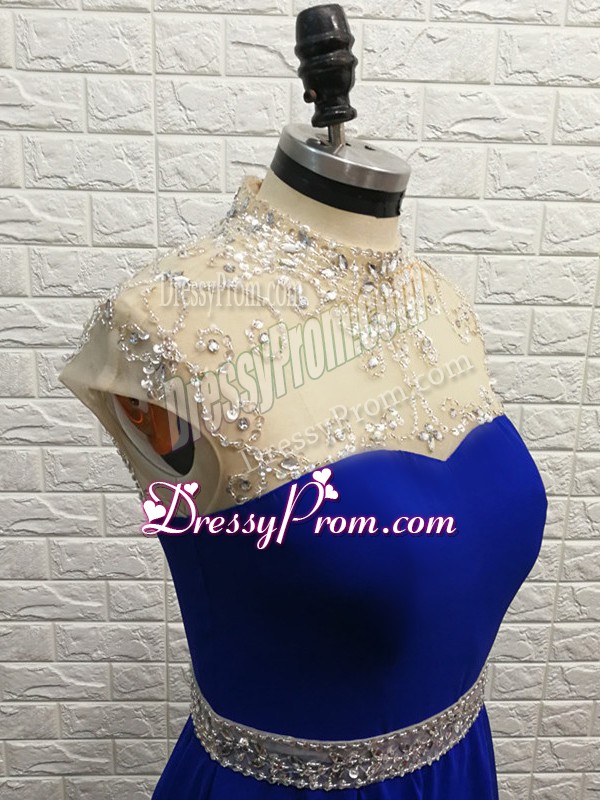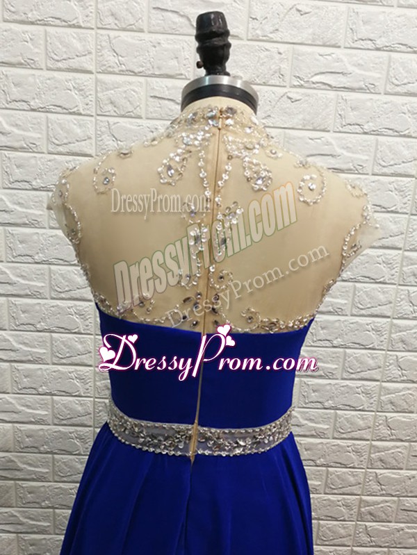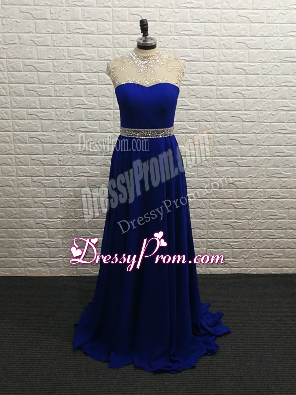 Neckline : High-neckShown Color : Royal BlueSilhouette : EmpireSleeve Length : sleevelessBack Detail : ZipperFabric : ChiffonEmbellishment : BeadingOccasion : Prom,Party,Military BallSeason : Spring,Summer,Fall,Winter