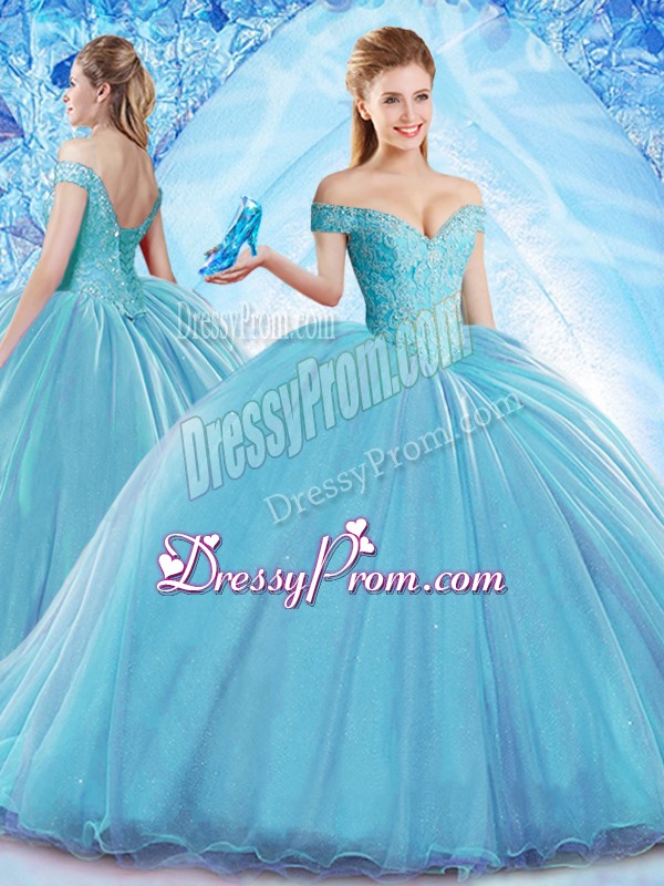Neckline : Off the shoulder Shown Color : Baby Blue Silhouette : Ball Gowns Sleeve Length : sleeveless Back Detail : Lace up Fabric : Organza Embellishment : Beading Occasion : Military Ball,Sweet 16,Quinceanera Season : Spring,Summer,Fall,Winter