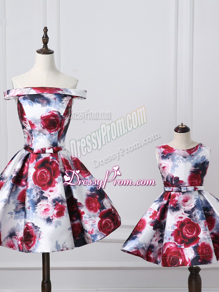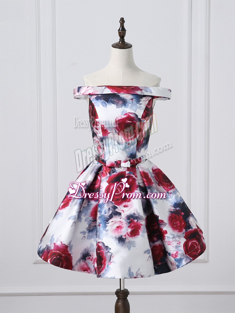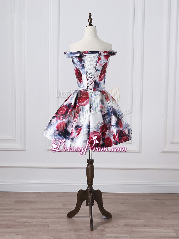 Neckline : Off the shoulder Shown Color : Multi-color Silhouette : A-line Sleeve Length : sleeveless Hemline : mini length Back Detail : Lace up Fabric : Printed Embellishment : Belt Occasion : Prom,Party,Sweet 16 Season : Spring,Summer,Fall