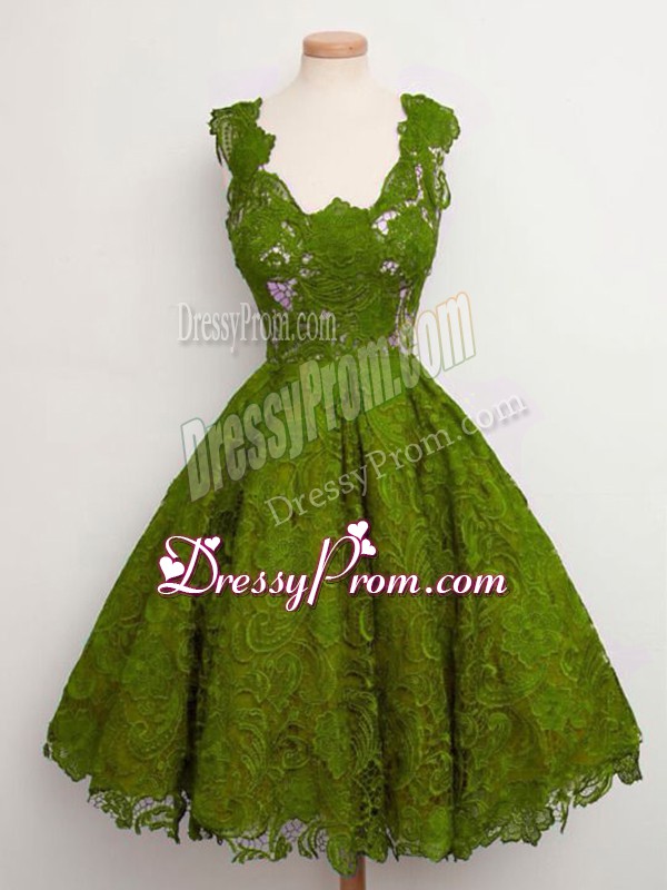 Neckline : StrapsShown Color : Olive GreenSilhouette : A-lineSleeve Length : sleevelessHemline : knee lengthBack Detail : Lace upFabric : LaceEmbellishment : LaceOccasion : Prom,Party,Wedding PartySeason : Spring,Summer,Fall