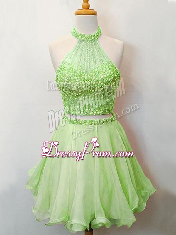 Neckline : Halter top Shown Color : Spring Green Silhouette : Two Pieces Sleeve Length : sleeveless Hemline : knee length Back Detail : Lace up Fabric : Organza Embellishment : Beading Occasion : Prom,Party,Wedding Party Season : Spring,Summer,Fall