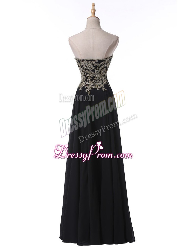 Neckline : SweetheartShown Color : BlackSilhouette : EmpireSleeve Length : sleevelessHemline : floor lengthBack Detail : Side zipperFabric : ChiffonEmbellishment : Beading,AppliquesOccasion : Prom,Military Ball,BeachSeason : Spring,Summer,Fall,Winter