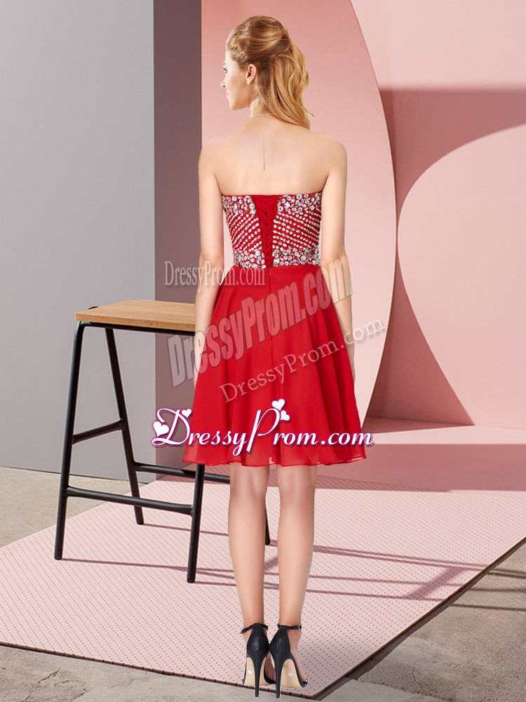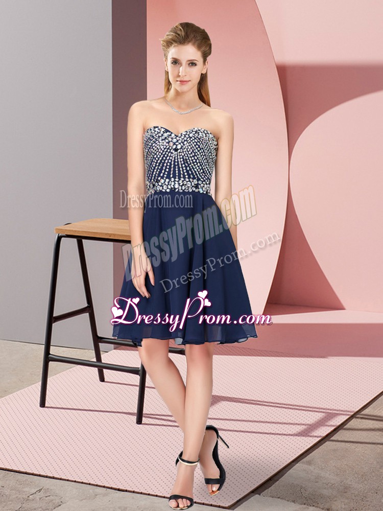 Neckline : SweetheartShown Color : Navy BlueSilhouette : EmpireSleeve Length : sleevelessHemline : knee lengthBack Detail : Lace upFabric : ChiffonEmbellishment : BeadingOccasion : Prom,Party,Sweet 16Season : Spring,Summer,Fall