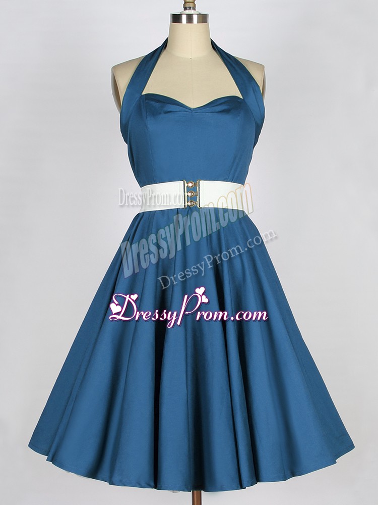 Neckline : Halter topShown Color : Teal Silhouette : A-lineSleeve Length : sleevelessHemline : knee lengthBack Detail : Lace upFabric : TaffetaEmbellishment : BeltOccasion : Prom,Party,Wedding PartySeason : Spring,Summer,Fall