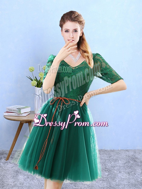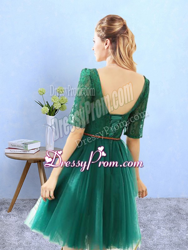 Neckline : V-neckShown Color : GreenSilhouette : A-lineSleeve Length : half sleevesHemline : knee lengthBack Detail : BacklessFabric : TulleEmbellishment : LaceOccasion : Prom,PartySeason : Spring,Summer,Fall