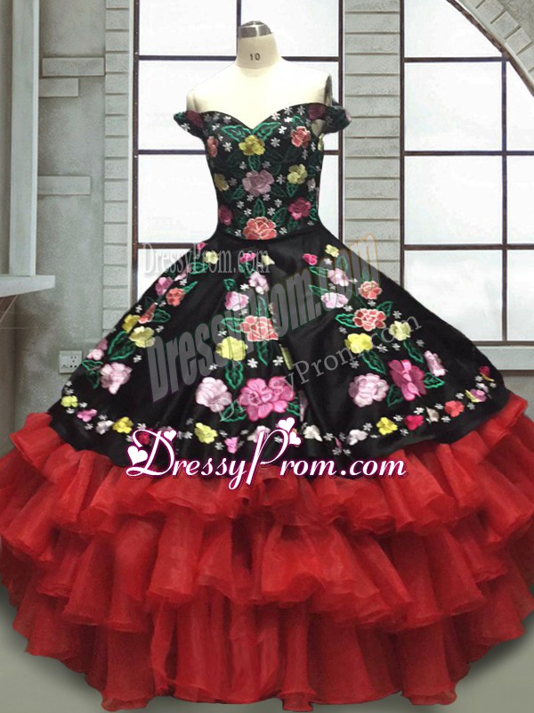 Neckline : Off the shoulder Shown Color : Red And Black Silhouette : Ball Gowns Sleeve Length : sleeveless Hemline : floor length Back Detail : Lace up Fabric : Organza,Taffeta Embellishment : Embroidery,Ruffled Layers Occasion : Military Ball,Sweet 16,Quinceanera Season : Spring,Summer,Fall,Winter