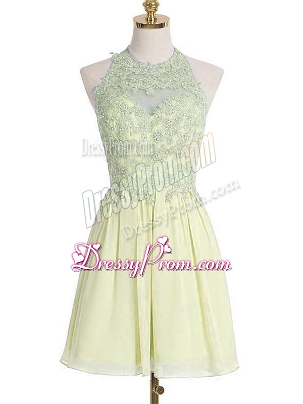 Neckline : Halter topShown Color : Light YellowSilhouette : EmpireSleeve Length : sleevelessHemline : knee lengthBack Detail : Lace upFabric : ChiffonEmbellishment : AppliquesOccasion : Prom,Party,Wedding PartySeason : Spring,Summer,Fall