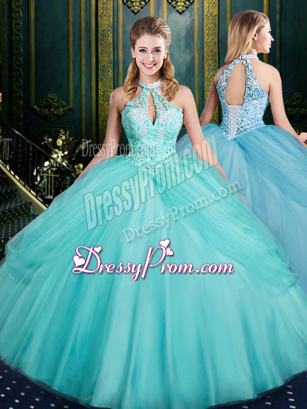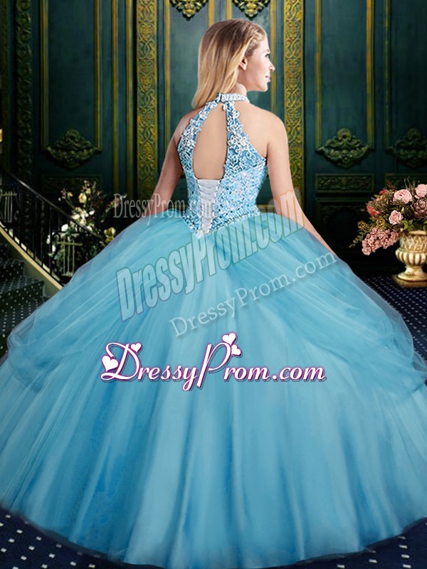 Neckline : Halter topShown Color : Aqua BlueSilhouette : Ball GownsSleeve Length : sleevelessHemline : floor lengthBack Detail : Lace upFabric : TulleEmbellishment : Beading,Pick UpsOccasion : Military Ball,Sweet 16,QuinceaneraSeason : Spring,Summer,Fall,Winter