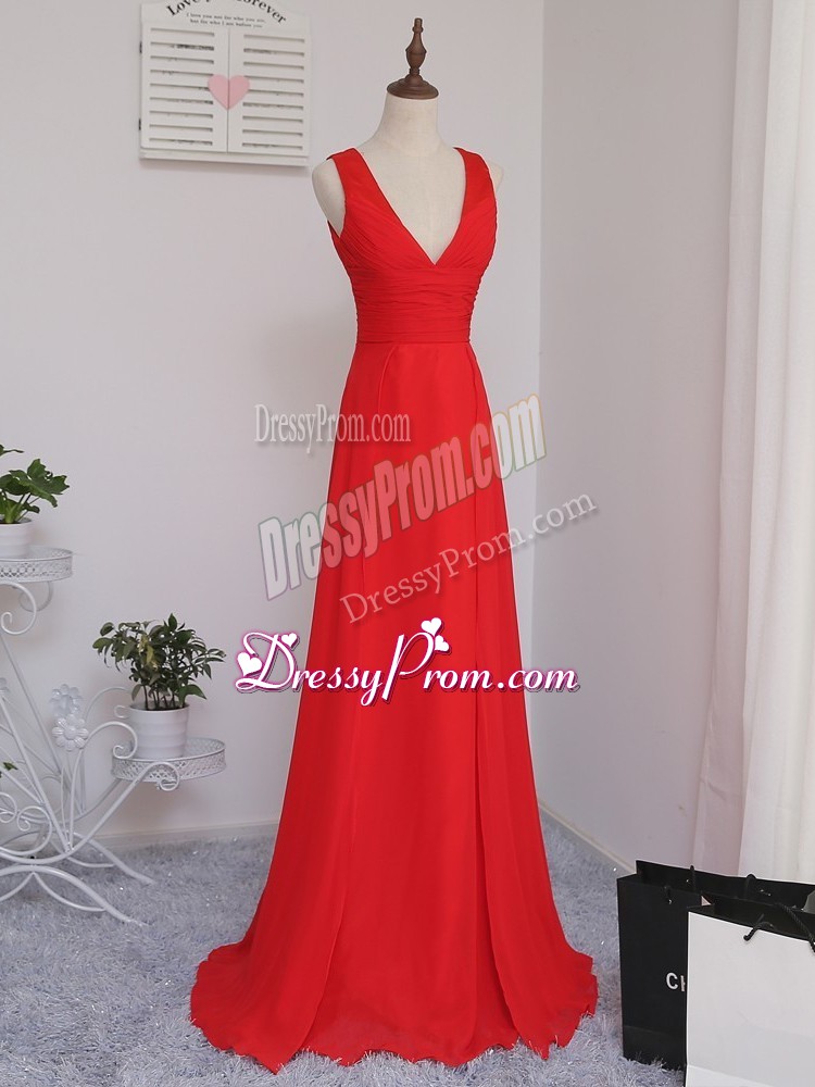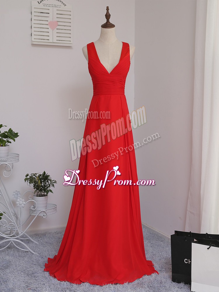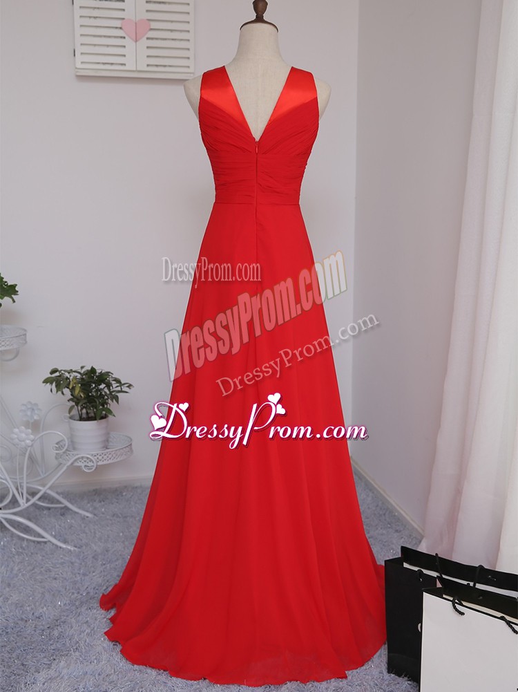 Neckline : V-neckShown Color : RedSilhouette : EmpireSleeve Length : sleevelessHemline : floor lengthBack Detail : ZipperFabric : ChiffonEmbellishment : RuchingOccasion : Prom,Party,Wedding PartySeason : Spring,Summer,Fall,Winter