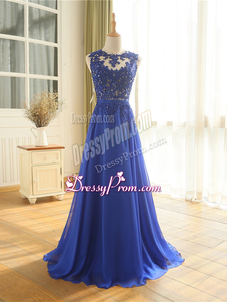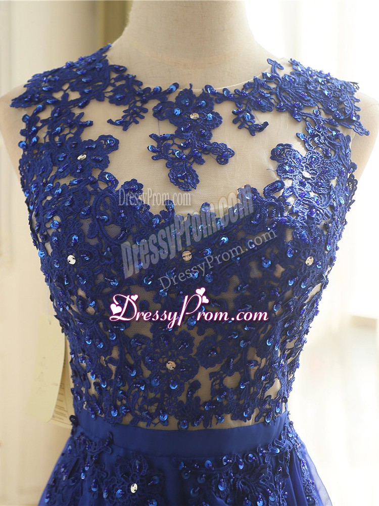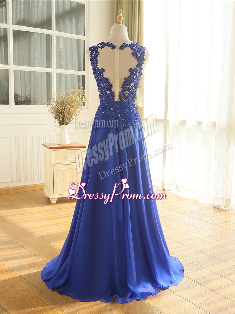 Neckline : ScoopShown Color : Royal BlueSilhouette : EmpireSleeve Length : sleevelessHemline : floor lengthBack Detail : ZipperFabric : ChiffonEmbellishment : AppliquesOccasion : Prom,Military Ball,BeachSeason : Spring,Summer,Fall,Winter