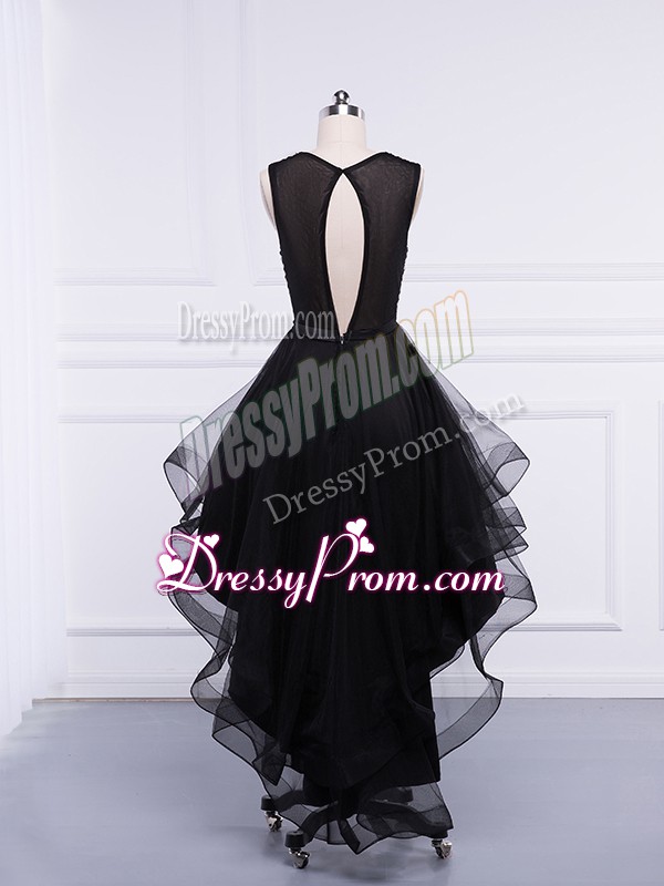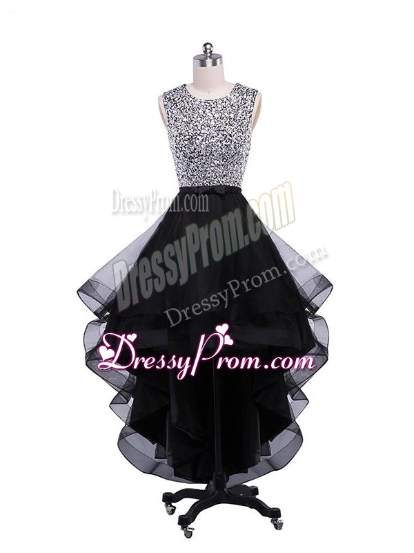 Neckline : ScoopShown Color : BlackSilhouette : EmpireSleeve Length : sleevelessHemline : high lowBack Detail : ZipperFabric : TulleEmbellishment : Beading,RufflesOccasion : Prom,Party,Sweet 16Season : Spring,Summer,Fall