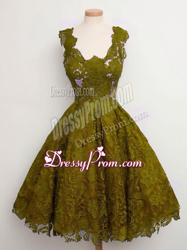 Neckline : StrapsShown Color : Olive GreenSilhouette : A-lineSleeve Length : sleevelessHemline : knee lengthBack Detail : Lace upFabric : LaceEmbellishment : LaceOccasion : Prom,Party,Wedding PartySeason : Spring,Summer,Fall