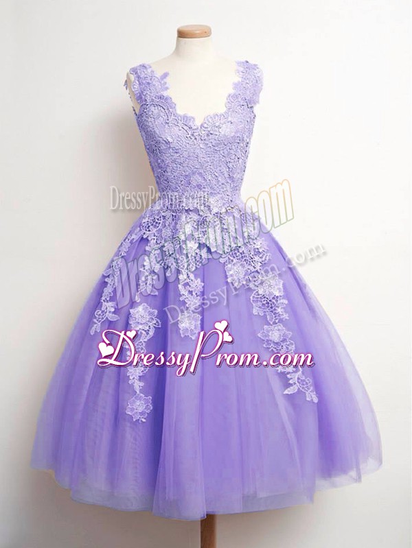 Neckline : V-neckShown Color : LavenderSilhouette : A-lineSleeve Length : sleevelessHemline : knee lengthBack Detail : Lace upFabric : TulleEmbellishment : LaceOccasion : Prom,Party,Wedding PartySeason : Spring,Summer,Fall