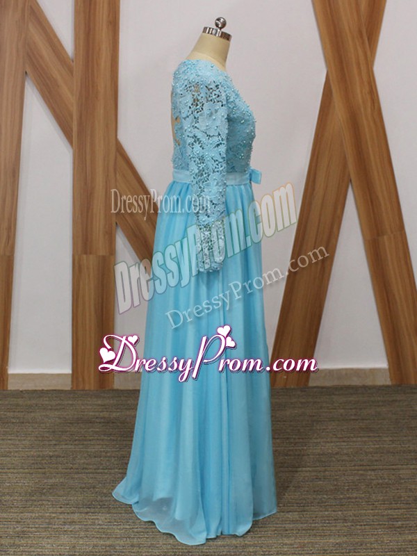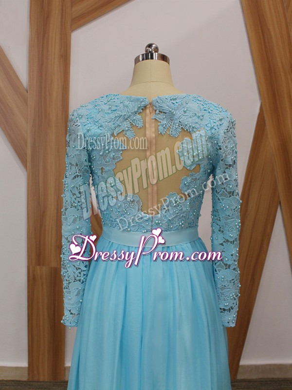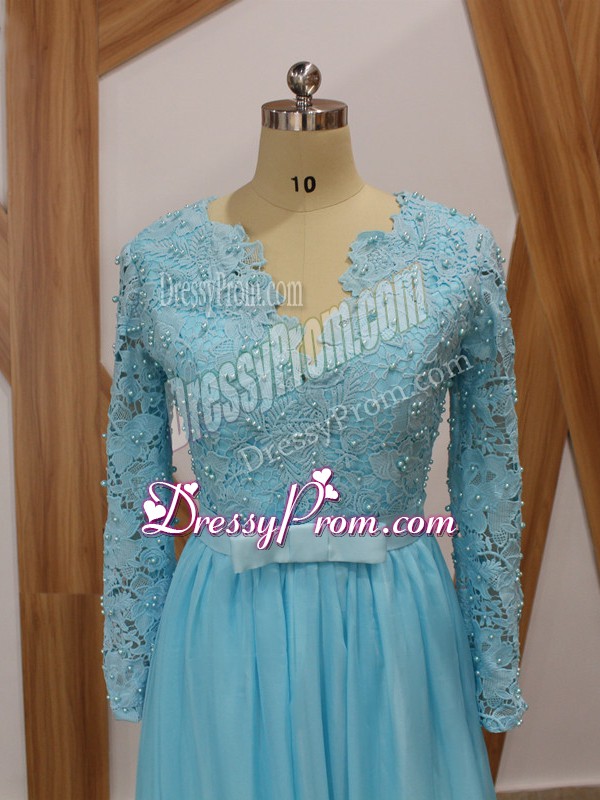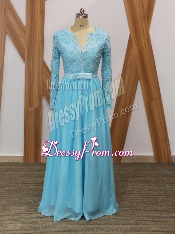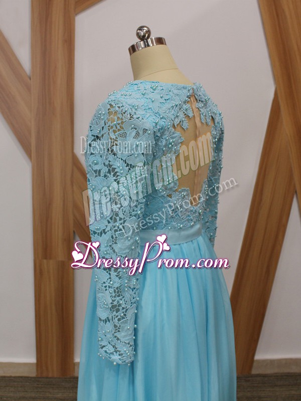 Neckline : V-neckShown Color : Baby BlueSilhouette : EmpireSleeve Length : long sleevesHemline : floor lengthBack Detail : BacklessFabric : ChiffonEmbellishment : LaceOccasion : Prom,Military Ball,Sweet 16Season : Spring,Summer,Fall,Winter