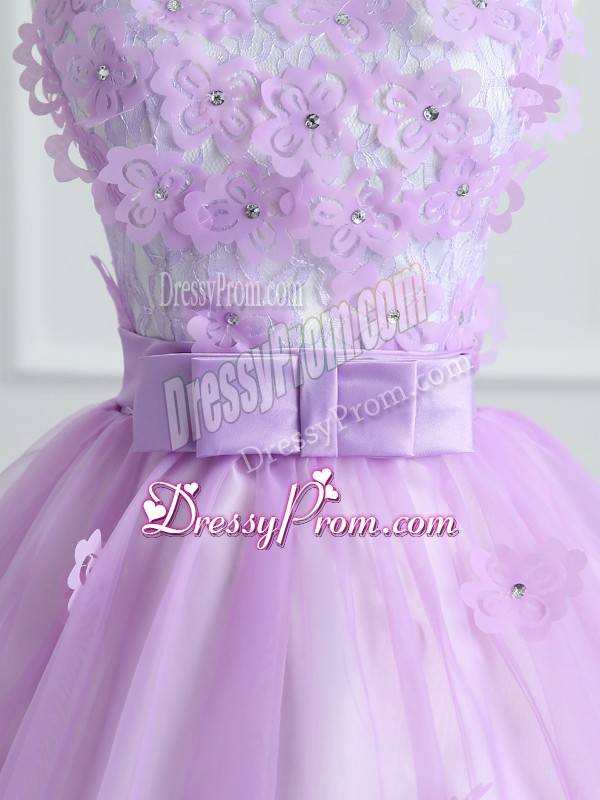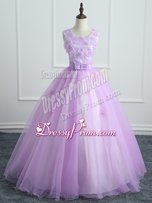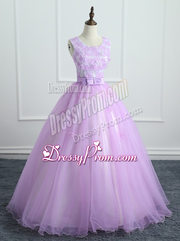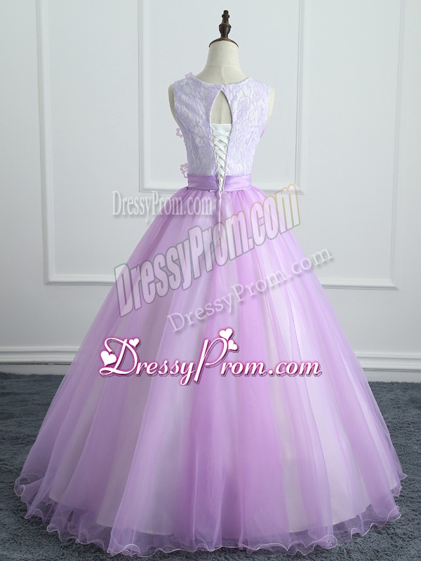 Neckline : ScoopShown Color : LavenderSilhouette : Ball GownsSleeve Length : sleevelessHemline : floor lengthBack Detail : Lace upFabric : OrganzaEmbellishment : Lace,Appliques,BowknotOccasion : Military Ball,Sweet 16,QuinceaneraSeason : Spring,Summer,Fall,Winter