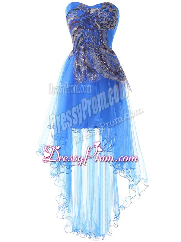 Neckline : SweetheartShown Color : BlueSilhouette : EmpireSleeve Length : sleevelessHemline : high lowBack Detail : Lace upFabric : TulleEmbellishment : AppliquesOccasion : Prom,Party,Military BallSeason : Spring,Summer,Fall,Winter