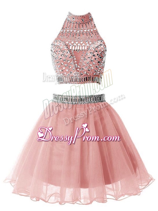 Neckline : High-neckShown Color : Pink Silhouette : A-lineSleeve Length : sleevelessHemline : knee lengthBack Detail : ZipperFabric : OrganzaEmbellishment : BeadingOccasion : Party,Wedding PartySeason : Spring,Summer,Fall