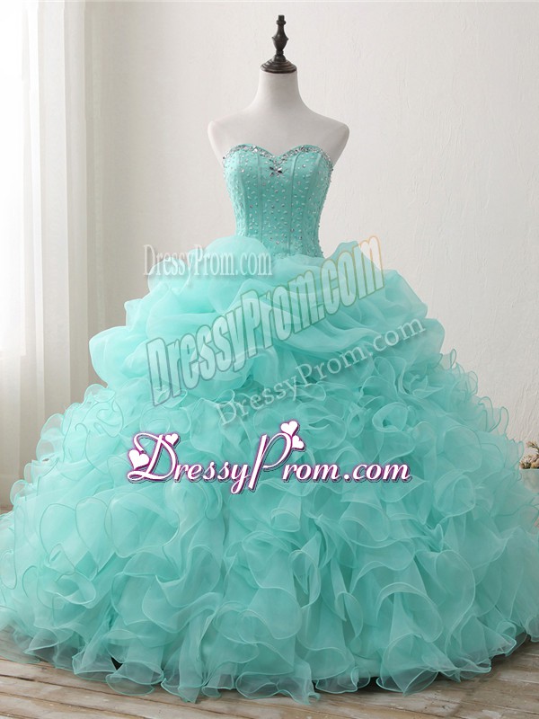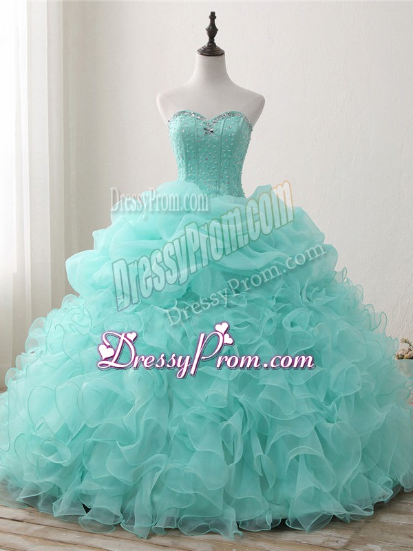 Neckline : SweetheartShown Color : Apple GreenSilhouette : Ball GownsSleeve Length : sleevelessHemline : floor lengthBack Detail : Lace upFabric : OrganzaEmbellishment : Beading,Ruffles,Pick UpsOccasion : Military Ball,Sweet 16,QuinceaneraSeason : Spring,Summer,Fall,Winter
