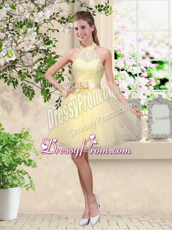 Neckline : Halter topShown Color : Light YellowSilhouette : A-lineSleeve Length : sleevelessHemline : knee lengthBack Detail : Lace upFabric : TulleEmbellishment : Lace,BeltOccasion : Prom,PartySeason : Summer,Fall